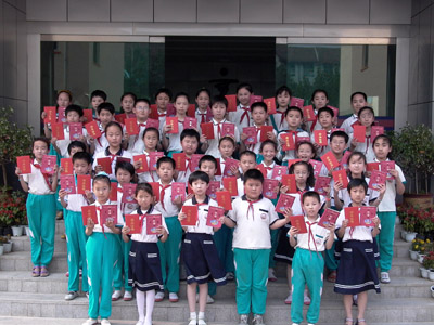山东省文登市实验小学在“我读书我快乐”活动中被评为“读书三士”的孩子们兴高采烈地留影。