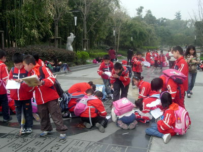 浣花公园的诗歌大道上,成了孩子们学习和“寻宝”的乐园