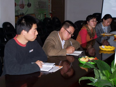 在我校三楼会议室,大家就外语学校英语教学等方面进行了轻松愉快的交流。首先由Mr.潘从总体方面介绍了我校的英语办学特色,然后我们从我校一系列关于英语教学及活动方面进行了介绍。Miss刘就教师培训方面做了说明;Mr.商将我们的生活英语、月考、教研课、推门课、备课、集体教研等有关于英语教学方面的工作进行了介绍;Mr.韩将我校英语博客建设呈现在大家面前;Miss徐和Miss毛将我们的校本英语节目——《毛毛姐姐学英语》进行了描述,最后Miss阳将学生参加的与英语有关的活动进行了展示。