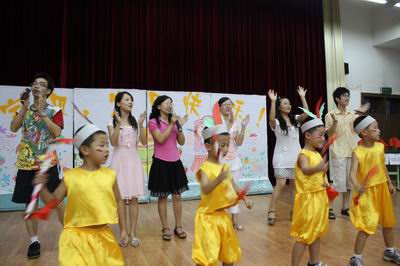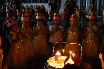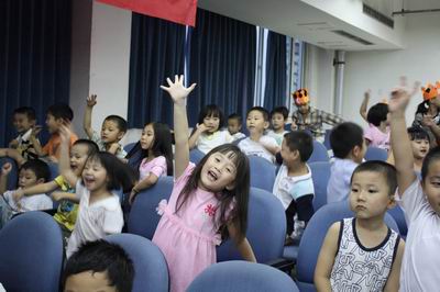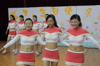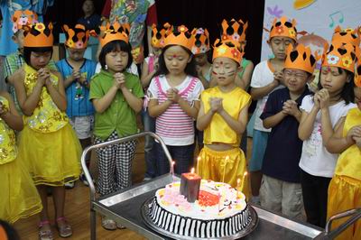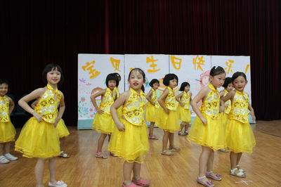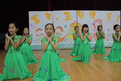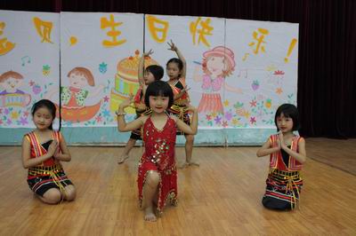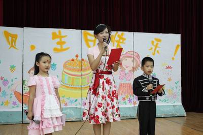 今天晚上,一年级为所有最近两个月过生日的孩子们举办了一场隆重的生日晚会。所有的孩子们都穿戴一新,过生日的孩子还戴上了美丽的皇冠。在这台生日晚会上,成都市工业学校健美操队的大姐姐们给小朋友们带来了充满活力的健美操,四年级的小姐姐们带来了美丽的孔雀舞。最了不起的是,一年级的小宝贝们才上学几天,已经在老师的指导下表演了“十个印第安小男孩”、“印度舞”等节目, 两个小主持人也是从一年级的小朋友中选出来的,所有的演员都赢得了老师和同学们的热烈掌声。