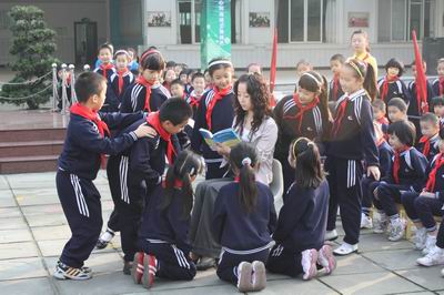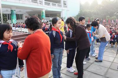 弥校长、吴校长、许校长为新当选的大队委颁发大队委标志