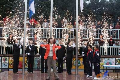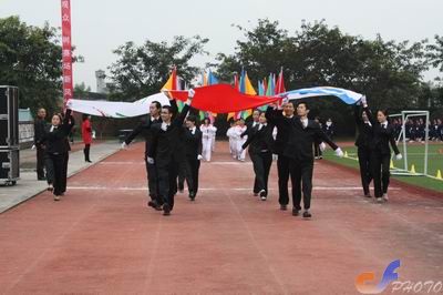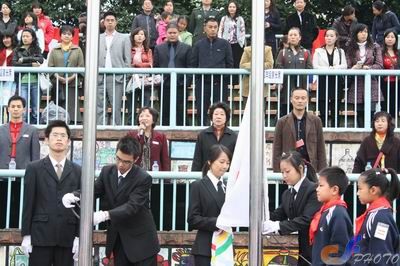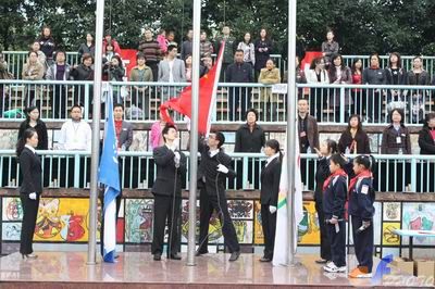 热情的烟花伴随着嘹亮的校歌声,校旗会旗正在徐徐升起