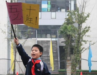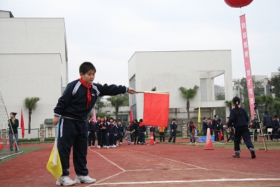瞧,这位同学挥舞着自制的小旗帜为自己的班级加油助威