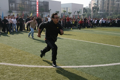 混合迎面接力赛开始了,你看老师们比参加比赛的同学还要激动。