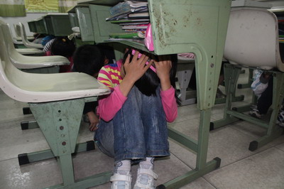 轻微地震来临了,孩子们躲在桌子下面手抱着头。