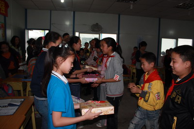 我校学生向六一班的孩子赠送小礼品,表达自己的一份心意。