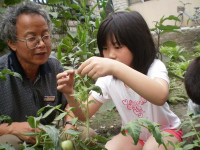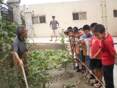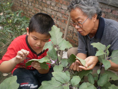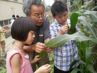 孩子们在刘老师的带领下给茄子、玉米“治病”