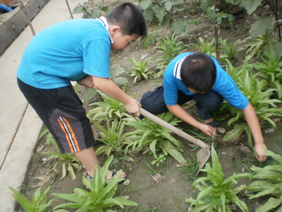 食堂后面废弃的一条沟,被刘老师开发成为红领巾养殖基地