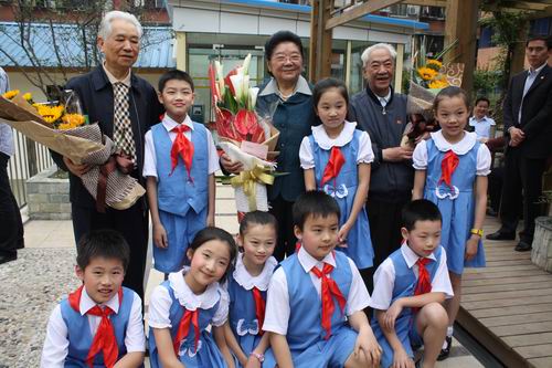 顾秀莲、四川省老干部与学校领导及献花孩子合影