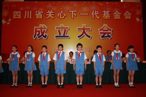 The Sichuan Provincial Foundation for the Caring of the Younger Generation was formally established June 18. On behalf of the 11,000,000 young children of the whole province, the students from our school wore red scarves for the predecessors of the