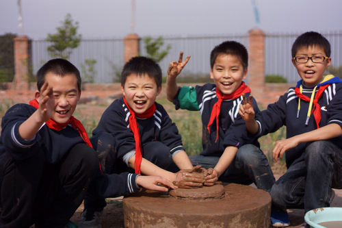 四个人齐心协力做出了一个碗以后大家都很兴奋