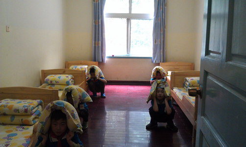 4月26日中午,我校生活部利用午休后的时间,在宿舍举行了防震演练。孩子们在生活老师和生活阿姨的组织下,紧张而有序的按照预定的路线撤离到安全地带。