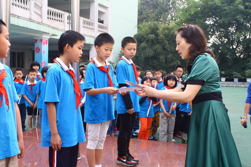 吴亚丽副校长为在“2013全国纸飞机通讯赛成都站留空计时赛”中获奖的同学颁奖