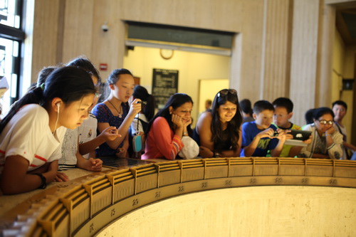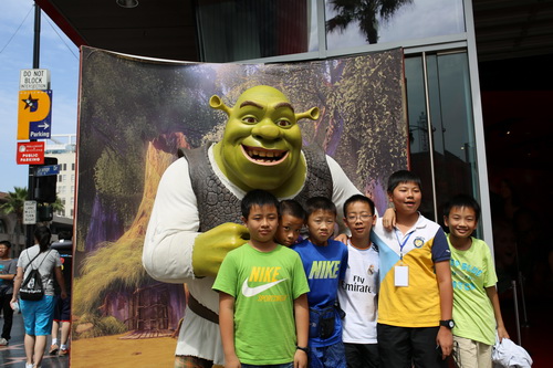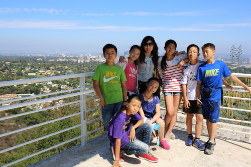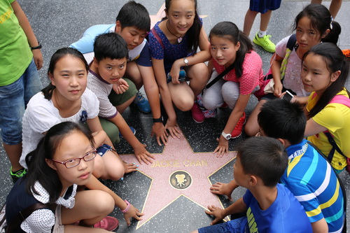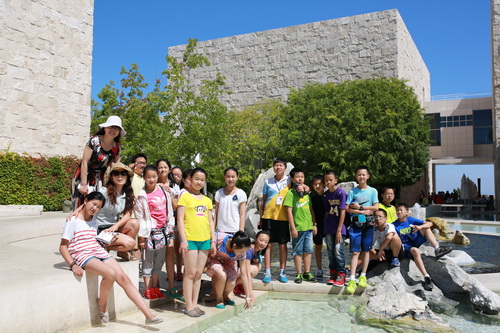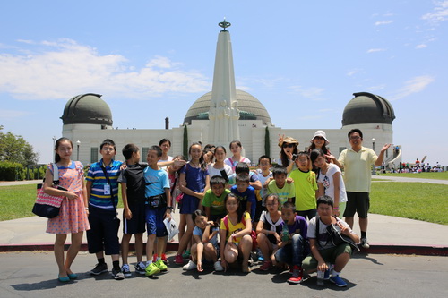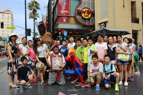 当地时间7月12日,赴美游学四团的同学们游览了好莱坞星光大道,参观了洛杉矶天文台和盖蒂博物馆。图为师生们在好莱坞颁奖地合影。