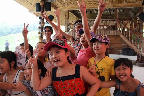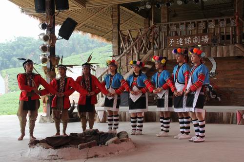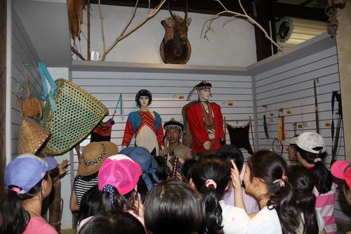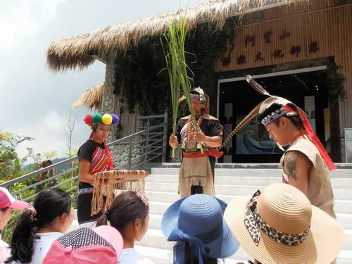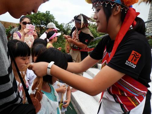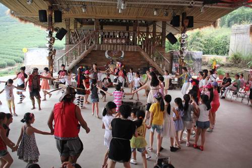 7月23日,金太阳艺术团的孩子们来到了阿里山,领略了别具一格的邹族文化。阿里山邹族文化部落位于台湾省嘉义县阿里山乡乐野村,海拔1300公尺左右的高山茶园中,歌曲《阿里山的姑娘》又名《高山青》中的“高山青,涧水蓝,阿里山的姑娘美如水啊,阿里山的少年状如山……”中所指的阿里山的姑娘、少年,正是阿里山邹族原住民的写照。阿里山的原住民是最早与荷兰通婚的民族,所以,他们的后裔都具有外国人的血统,高鼻子,大眼睛,非常漂亮。