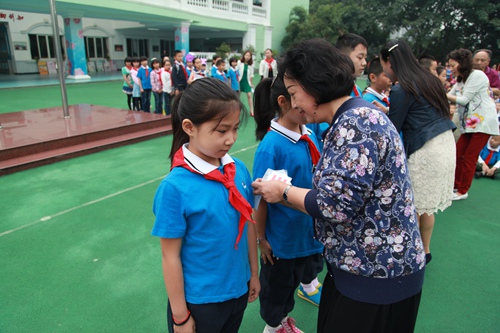 在上一个月的考察中,大队委已经由老师和同学评选出来,今天由弥校长、吴校长、钟校长为他们佩戴大队委标志。