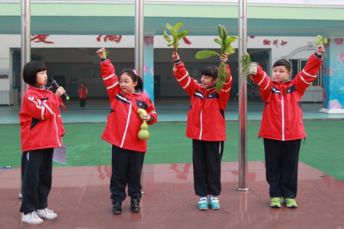 On November 18th morning, the twelfth week morning gathering was held in our school. On the meeting the children showed their harvest under hard work. In the "green garden" the carefully cultivated vegetables and fruits finally harvest !