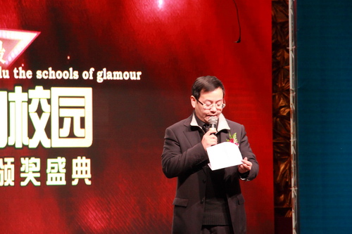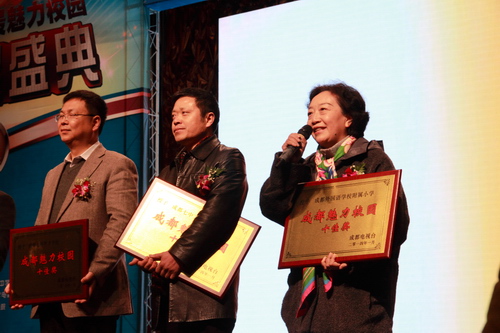 成都市教育学会会长纪大海先生为获得“十佳魅力校园”的学校颁奖