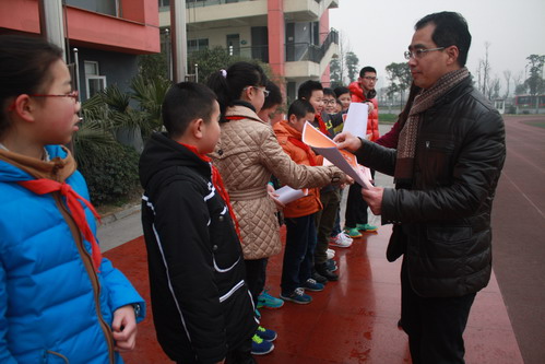 学校领导为获得“零事故安全班级”的班级颁发奖状