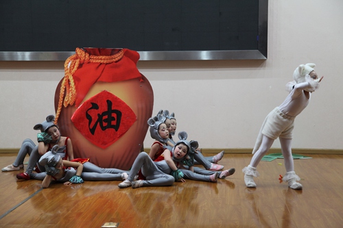 一年级的8位小朋友在茶店子小学(南区)表演课本剧:《猫和老鼠》