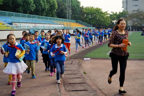 晨曦微露,孩子们在老师的带领下在操场上跑步