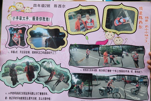 四二班的陈希尔同学上台分享假期里当环卫工人的故事