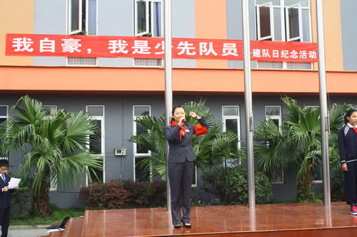 少先队辅导员朱珊珊老师带领全体队员呼少先队口号:准备着为共产主义事业而奋斗!