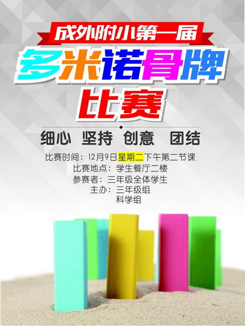 12月9日下午,三年级全体同学在科学老师的组织下,成功举行了我校第一届多米诺骨牌比赛。多米诺是一种游戏,也是一种运动。孩子们兴味盎然地参与比赛,既锻炼了个人能力,也培养了团队协作的精神。