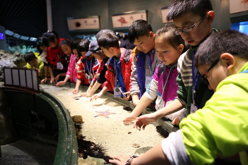 在导游姐姐的带领下与海参、海胆、海星、海兔“握手”