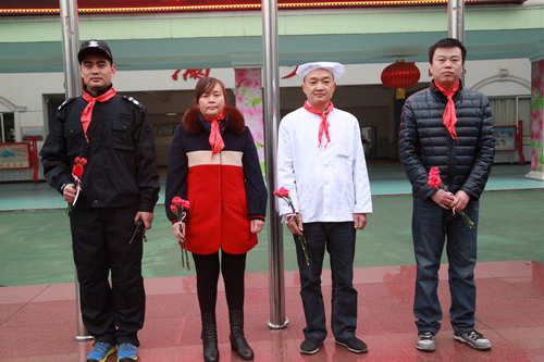 同学们为我校的服务人员戴上红领巾,对他们表示感谢