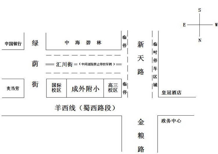 1、学校大门外“汇川街”道路的中间路段不能停车;