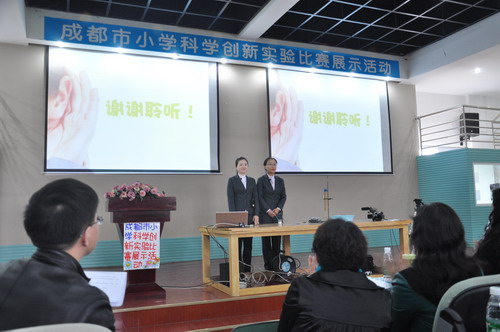 4月10日,我校科学组刘倍伶、甘晓锦两位老师在金沙小学清波校区,参加了2015年“成都市创新实验比赛展示”活动。此次比赛是在去年成都市所有参加实验比赛的一等奖选手中,筛选出13所学校进行复赛。我校的创新实验《观察和比较鼓膜的振动模拟实验》再次荣获一等奖。在此,感谢金牛区教培中心和成都市教科所对我校科学组的肯定与鼓励,我们会继续前行!