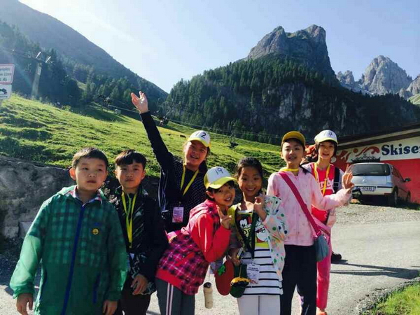 孩子们跑上山坡,争着和奶牛合影,跟奶牛说话,喂奶牛吃草,连声问今早的牛奶是不是这些奶牛身上挤下来的;他们在草坪上打滚、采野花、兴奋地合影。从山路上走来一对对登山的外国人,他们拄着铁杖,打着结实的绑腿,孩子们用英语同外国客人打招呼,询问对方自哪儿来到哪儿去,听对方说起要翻越远处的山峰,孩子们惊讶不已,称赞对方:“You are my superman!”