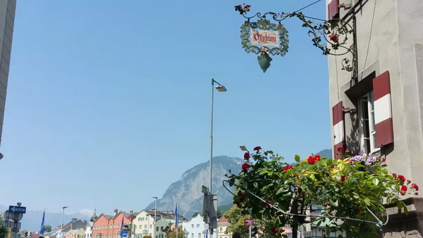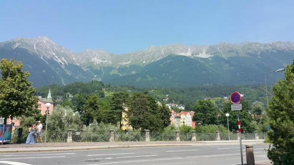 吃完丰盛的早餐,我们来到因斯布鲁克,这座美丽的小城坐落在阿尔卑斯山谷之中,旁边流淌着因河。无论在因斯布鲁克的哪一个角落,都能见到闪闪发光的山峦,今年气候炎热,雪虽化去,阿尔卑斯山却不曾失去一分美丽。
