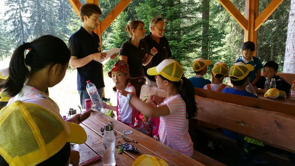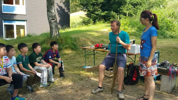 在营地学习的这段时间,每门课程基本上都配置2-3名非常优秀的专业的德文老师。他们都很谦逊,对小朋友、对老师、对同事都是如此。他们的“谦逊”里,就含有尊重他人的意思。世界是多元构成的,要彼此尊重,这是孩子们到营地接受的最先教育。而这份教育理念会落实在之后的每一个小细节中。比如孩子们几乎都在草地上上课,看到小虫子老师会告诉孩子们尊重它们,不能随意伤害;草坪上野花非常多,老师会教育孩子们尊重野花,不要人人去采,营地每天只由一个人负责采摘一束野花插在花瓶里;我们在森林里徒步,老师会告诉孩子们,要轻轻悄悄进入森林,不要打扰森林中的动物;小朋友在营地洗浴弄湿地面,老师会让孩子们仔仔细细观察这栋房屋,告诉孩子房屋已修建几十年,但并不显得破旧,那是因为人人都尊重它,不会破坏它。