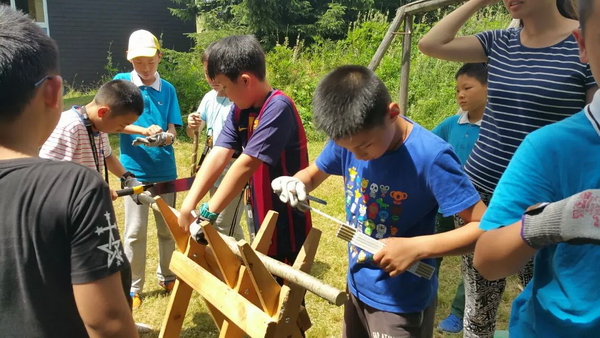 营地安排的非洲鼓课程、徒步课程、造船课程、木工课程、骑士日钻木取火课程、戏剧课程,都是让孩子在实践活动中收获认知,在整个活动中学会尊重、团结、协作、持之以恒、独立、创新。整个课程开始之前德国老师特意给我们随队老师讲,孩子们在活动中一定会出错,一定会有危险,但老师不能因为孩子会错会有危险就包办代替,一定要让他们亲自体验,在错误中形成正确的认知,在危险中学会自我保护。比如木工课程,孩子们使用的就是非常专业非常锋利的小刀。我们都非常担忧孩子们伤到手怎么办?德国老师告诉我们,德国小朋友三岁上幼儿园就会开始学习使用刀具,他们认为孩子越小使用刀具越好,他们会真切认识到刀具的锋利与危险,在实践操作中慢慢学会自我保护与正确使用刀具的方法,并且因为孩子幼小,力量不够大,受伤不会太严重。如果个子长得很大之后再学习使用刀具,孩子力量变大,对自身的伤害也大,这样的教育时机显然是不合适的。