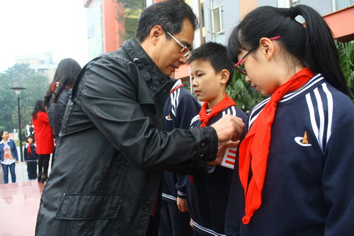 学校领导为新一届大队委佩戴大队委标志