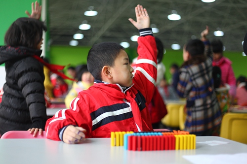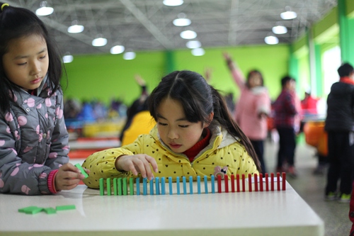 比赛开始,同学们认真搭起了骨牌