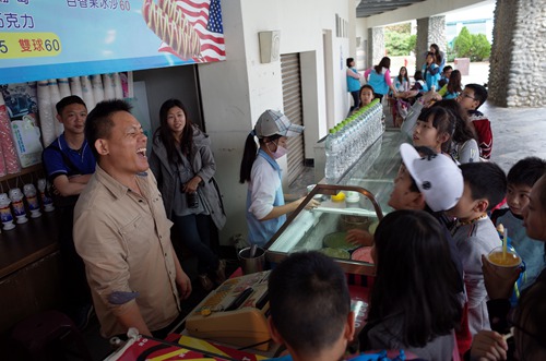 和孩子们猜拳的冰淇淋店老板,赢了老板可以免费获得一个冰淇淋哦!
