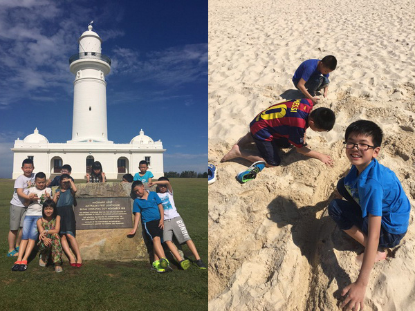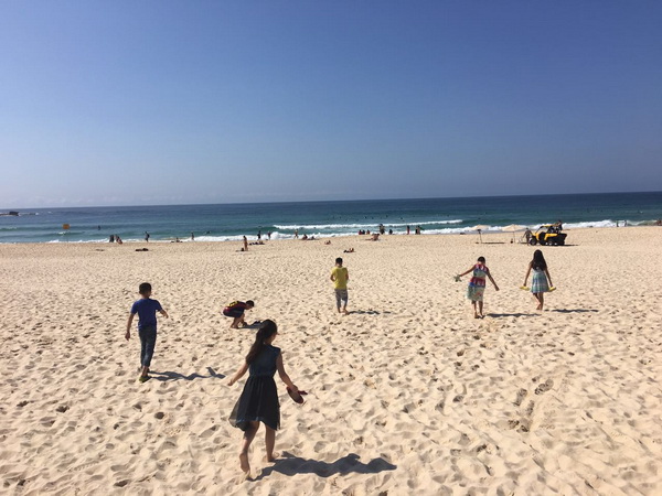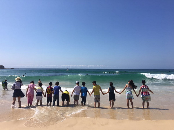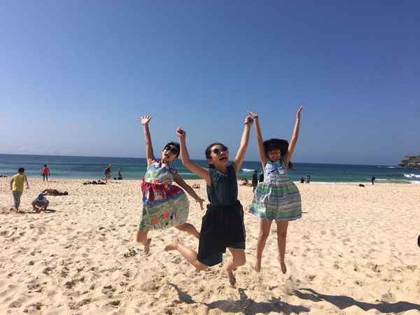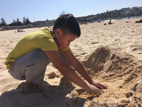清晨的第一缕阳光唤醒了沉睡中的孩子们,孩子们越发熟练地乘坐公车来到集合地点。在导游叔叔的带领下,我们来到了悉尼著名景点—邦迪海滩。一见到大海、沙滩,孩子们就像看到了巨大的游乐园一样,眼睛直发光,恨不得马上就能飞奔到大海边,让海水亲吻自己的脚丫,与沙滩来个亲密拥抱。老师阻止了他们,因为导游说这边的太阳与其他地方不一样,天空中有臭氧层空洞,它没有经过臭氧层直射到大地,如果人体皮肤没搽防晒霜而直接被晒的话,要不了20分钟皮肤就会被晒伤、脱皮,所以澳大利亚是患皮肤癌几率是全世界之首。我们组织孩子做好防晒工作后,来到了令他们兴奋不已的沙滩,一踩进去孩子们就嚷嚷着要脱掉拖鞋,这里的沙子很细软,踩起来非常非常的舒服。一甩掉脚上的束缚,他们便乐不可支地开始了自己的活动,拍照、奔跑、修城堡......看着那一张张笑脸,真是觉得人生最大的乐趣莫过于此了。