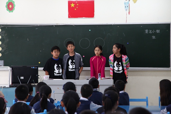 附小的同学用英文向客人们介绍子自己的校园