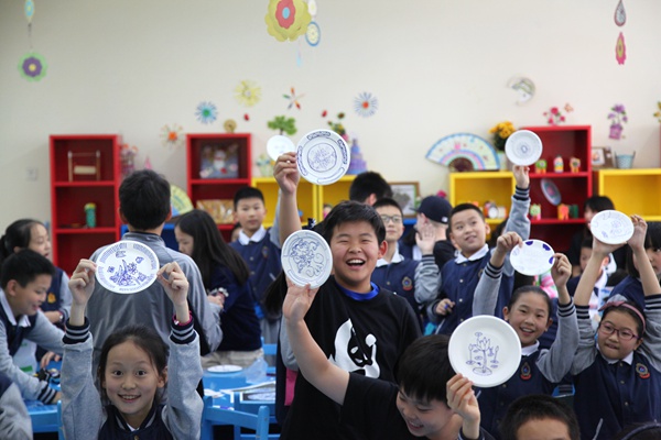 课后大家展示自己制作的青花瓷盘