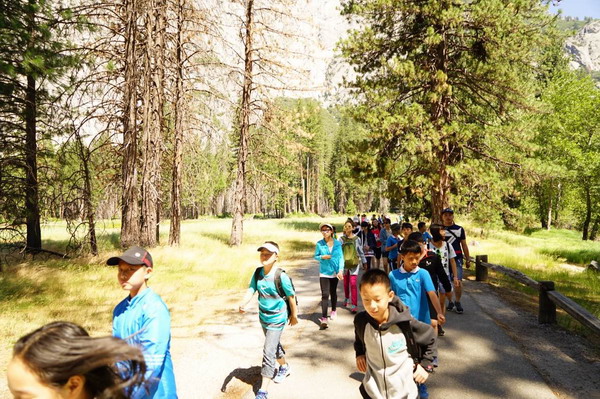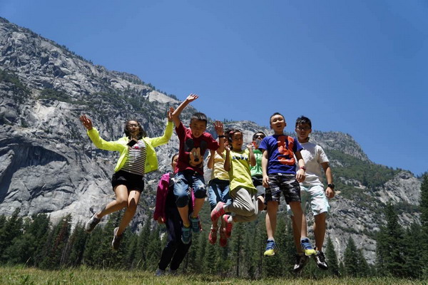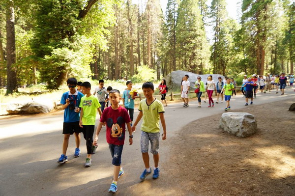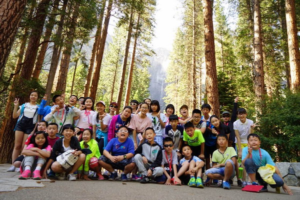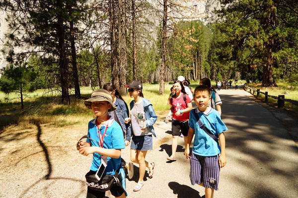 7月3日,赴美游学团一大早便聚集在瓦卡维尔学校,和美妈美爸告别之后便乘坐巴士前往美国西部最美丽的国家公园—优胜美地国家公园。孩子们在老师的带领下,愉快地漫步在公园的林荫之中。在园内,孩子们近距离地接触了小松鼠,和好朋友一起聊天拍照,无比惬意。 在去到优胜美地瀑布脚下的时候孩子们都忍不住一阵欢呼,三段轻纱似的瀑布飞泻而下,给葱茏碧绿的公园增添了别样的美。整个行程中,孩子们初步体验了优胜美地国家公园奇迹般的美。7月4日,优胜美地国家公园,明媚的阳光,潺潺的小溪,挺拔雄伟的高山,活泼可爱的小松鼠,以及茂密修长的红杉树都深深吸引着大家的目光,孩子们和老师一起轻松愉悦地畅游其中。中午十二点,大家在林中愉快地享用了可口的三明治、新鲜的水果。一阵休息之后,孩子们在老师的组织下脱下鞋子,在清澈见底的小溪里嬉戏。潺潺流淌的小溪给夏日带来了丝丝凉爽。那阵阵欢笑声,飘荡在小溪边,也飘荡在孩子们的心间。