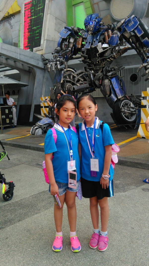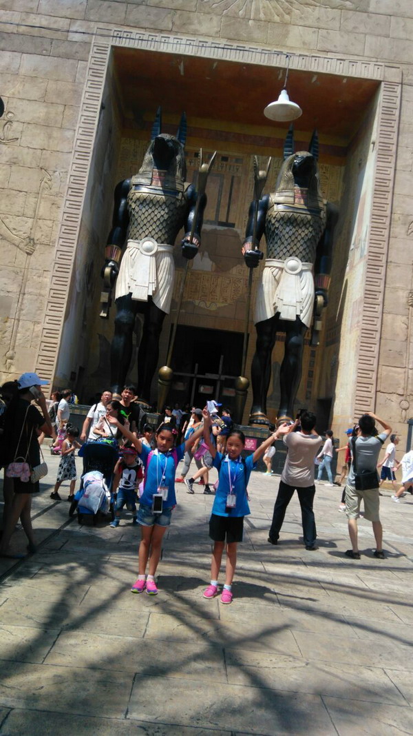 今天我们去的是环球影城,有同学早就在盼望着了……看美国大片的特技制作,瞧《未来水世界》的特技表演,坐着战车去帮助擎天柱保护火源,与霸天虎勇敢战斗,走走古埃及的复仇之路等等,都刺激而有趣。在里面的一天时间很快就过去了……美好的时光怎么总是那么短暂呢!