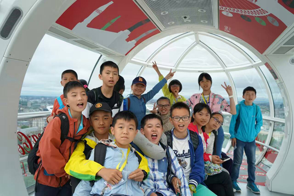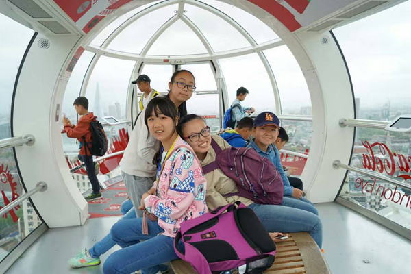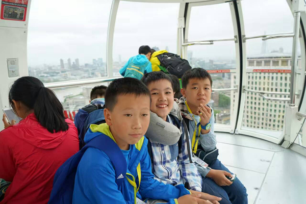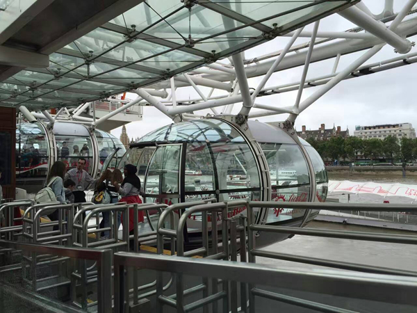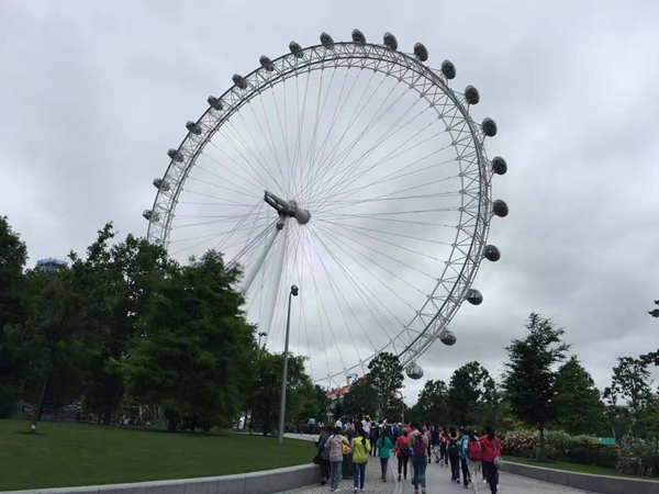 营地学习结束,回到伦敦,乘坐伦敦眼,伦敦景色尽收眼底。 伦敦眼(The London Eye)坐落在英国伦敦泰晤士河畔,是世界上首座摩天轮,伦敦的地标及出名旅游观光点之一。伦敦眼共有32个乘坐舱(由序号1排列到33。因为宗教忌讳,没有13号),舱内外用钢化玻璃打造。