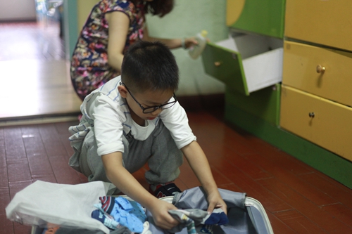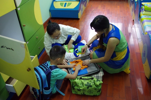在生活老师的帮助下把自己的衣服归类摆放到学校的衣柜