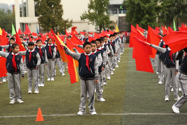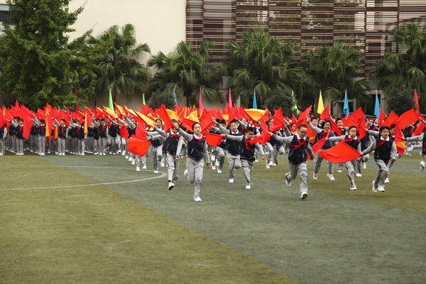 开幕式之后是学生团体操表演。在之前的几周,五年级的同学们克服重重困难,利用课余时间,排练了团体操:《旗扇之舞》,当羽扇遇到锦旗,红黄的海洋出现一抹蔚蓝,天空会变得五彩斑斓!六年级的同学表演了广播体操,整齐划一的动作,干练灵动的身姿,像一只只舞蹈的精灵,雀跃着冲进我们的心灵!