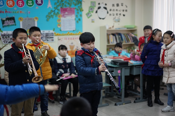 孩子们在老师的带领下表演节目,运用英语,体验西方的文化。