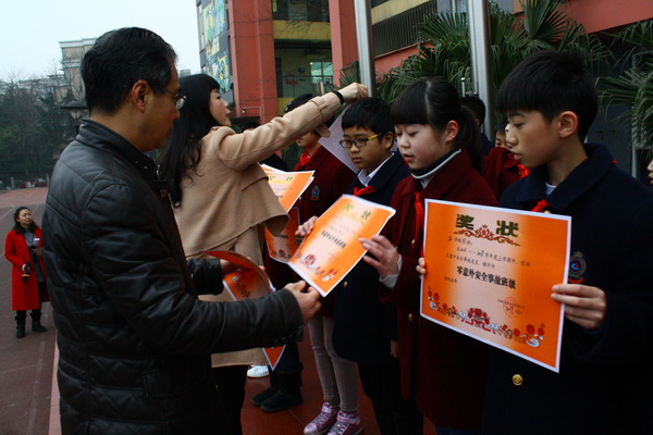 学校领导为上学期获得“零意外安全事故”的班级颁奖