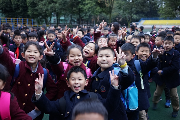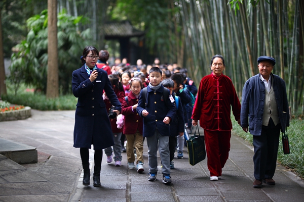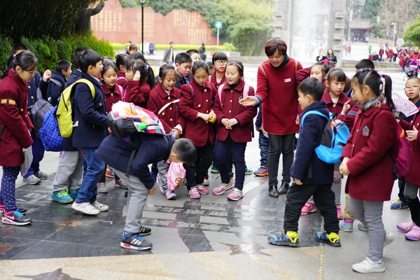 孩子们一早乘坐大巴从学校出发到达草堂